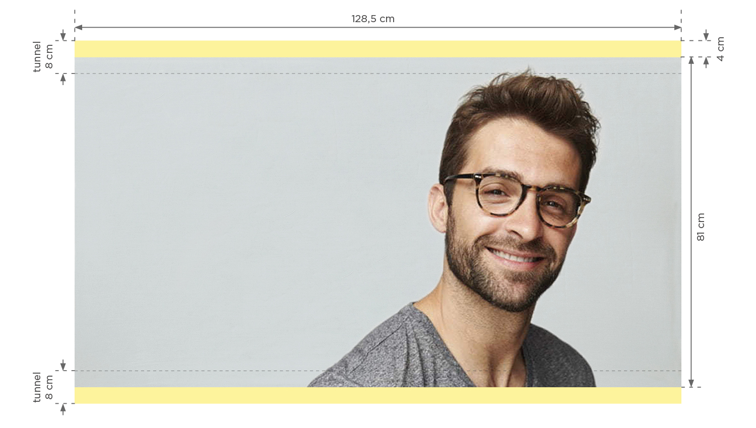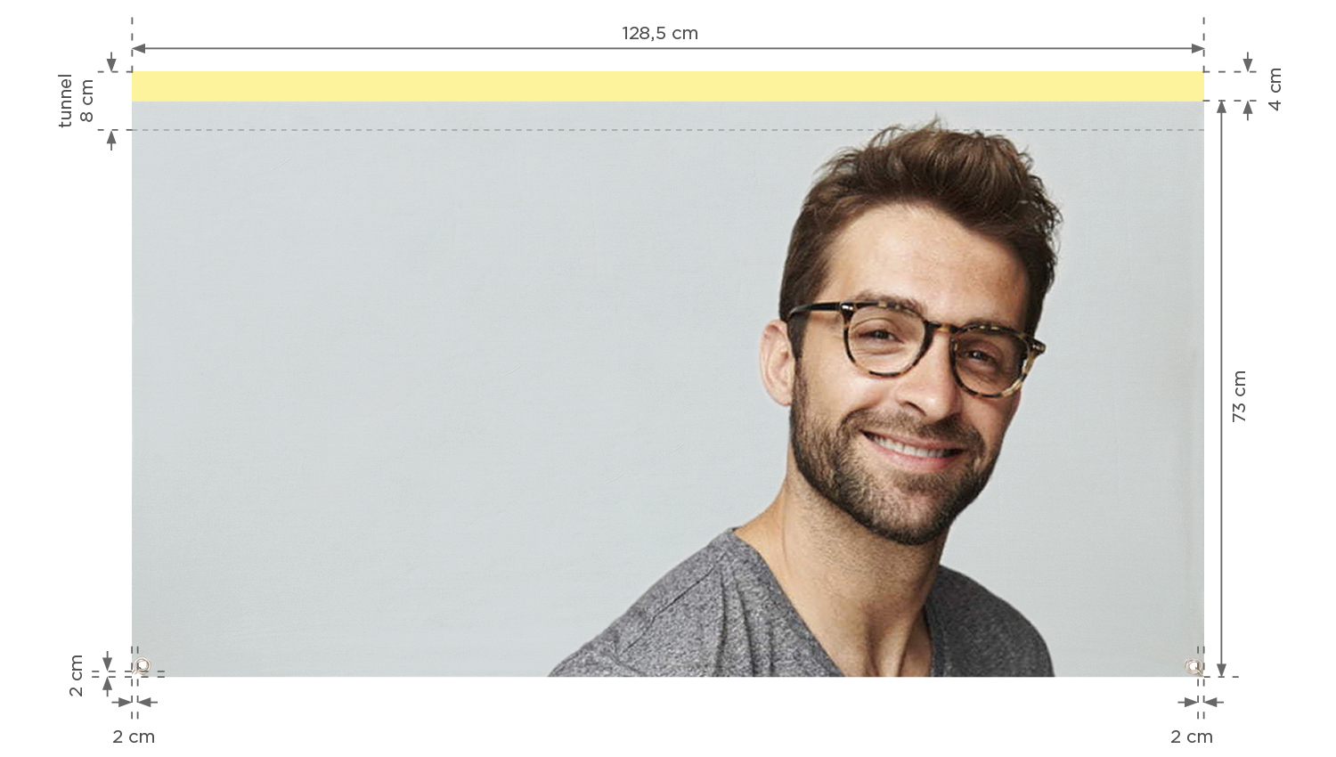Grafika se uchycuje shora pomocí horní tyče, která se zasune do tunelu, a zespodu pomocí napínáků přichycených k očkům na spodní části potisku. Upozorňujeme, že oblast označená žlutě by neměla obsahovat žádné prvky grafického návrhu. Doporučeným materiálem pro tento systém je frontlit banner s gramáží maximálně 510 g/m².