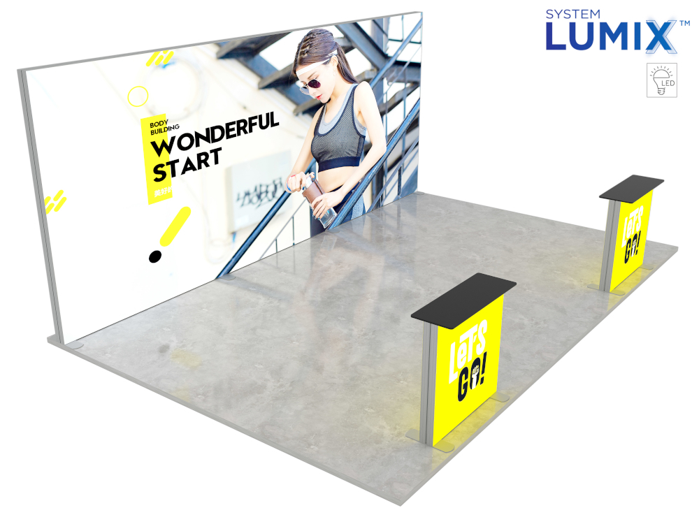 LUMIX™ výstavní stánek 18 m² (6x3) Peninsula   Lumix™ system 500x250 - 1 ks LUMIX™ výstavní stánek 18 m² (6x3) Peninsula   Lumix™ stolek - 2 ks LUMIX™ výstavní stánek 18 m² (6x3) Peninsula   XL sada 100 - 1 ks