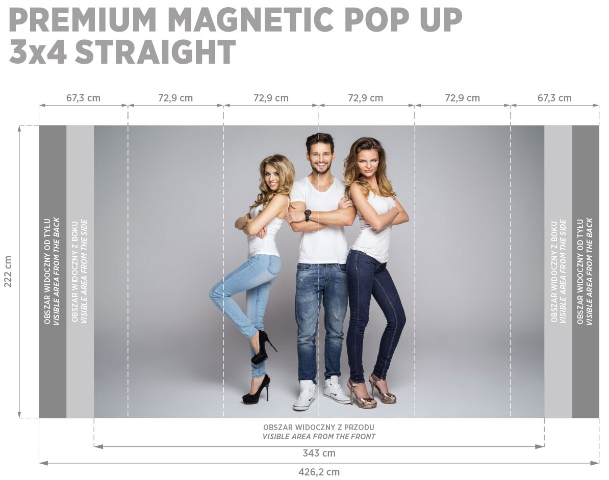 Reklamní stěna Premium je vybavena lehkou skládací hliníkovou konstrukcí, kterou lze rozložit jediným plynulým pohybem. Díky praktickému Pop Up mechanismu je instalace mimořádně rychlá a intuitivní. Inovativní magnetický systém neviditelného uchycení PVC panelů zajišťuje čistý a elegantní vzhled bez rušivých prvků na pohledové straně. Konstrukce umožňuje snadnou výměnu jednotlivých panelů, což poskytuje vysokou flexibilitu při změnách grafiky podle konkrétního zaměření prezentace. Kompaktní rozměry ve složeném stavu usnadňují manipulaci, přepravu i skladování.