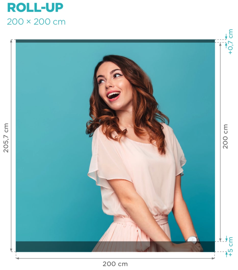Prostory vyznačené v horní a dolní části šablony leží mimo bezpečné oblasti. Tato část grafiky: dole bude navinuta do kazety, nahoře bude skryta pod horní lištou. Důležité prvky návrhu by se proto neměly nacházet v těchto oblastech. Doporučený materiál pro tento systém je Stoplight s gramáží do 330 g/m².