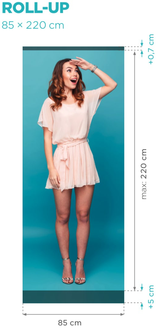 Roll Up s jedinečným vzhledem mořské vlny, vybavený systémem pro snadnou výměnu tisku a výškově nastavitelnou tyčí. Grafika se upevňuje pomocí zaklapávacího mechanismu bez použití lepicí pásky, což umožňuje opakovanou výměnu motivu a výrazně snižuje náklady. Díky horní liště Express Clip je instalace grafiky otázkou několika sekund. Teleskopická tyč umožňuje nastavení výšky až do 220 cm. Vysokou kvalitu, elegantní vzhled a perfektní stabilitu zajišťuje hliníková kazeta se stříbrnými bočnicemi. Roll Up je dodáván v polstrované přepravní brašně s podélným otevíráním, která usnadňuje transport i manipulaci.