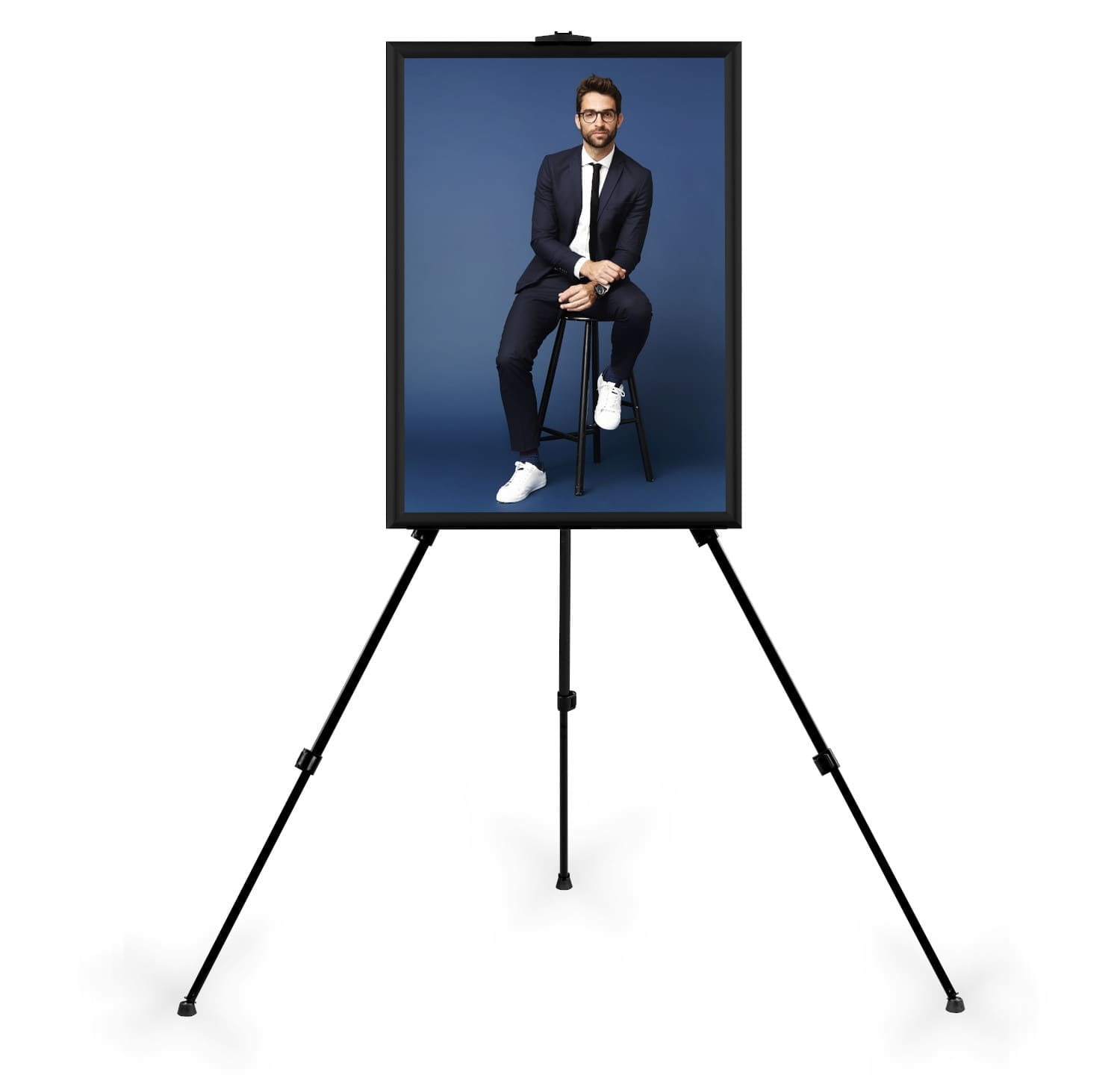 Elegantní a praktický stojan určený pro prezentaci grafiky na plexi deskách, PVC materiálu či v klaprámech. Díky své univerzálnosti je ideální pro výstavy, prezentace nebo reklamní účely. Stojan lze snadno složit do kompaktního formátu pro pohodlné přenášení i skladování. Celokovová konstrukce s černým práškovým lakováním zajišťuje odolnost a stabilitu. Součástí balení je také stylová přepravní brašna pro bezpečný transport.