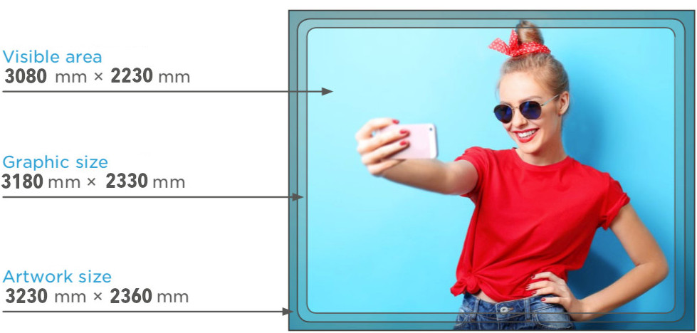 Prostor mezi „rozměr grafiky“ a „viditelná plocha“ se nachází mimo bezpečnou plochu. Upozorňujeme, že důležité prvky grafického návrhu by neměly být umisťovány do této oblasti.