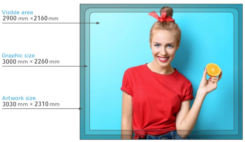 Prostor mezi „rozměr grafiky“ a „viditelná plocha“ se nachází mimo bezpečnou plochu. Upozorňujeme, že důležité prvky grafického návrhu by neměly být umisťovány do této oblasti.
