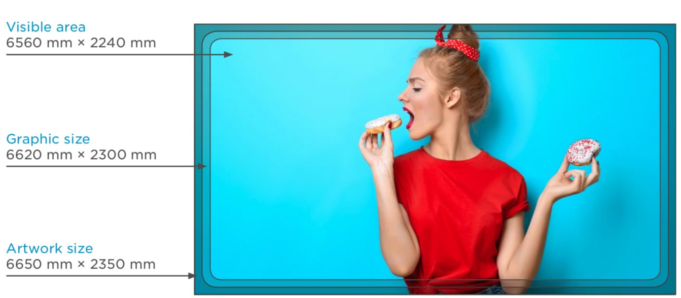 Prostor mezi „rozměr grafiky“ a „viditelná plocha“ se nachází mimo bezpečnou plochu. Upozorňujeme, že důležité prvky grafického návrhu by neměly být umisťovány do této oblasti.