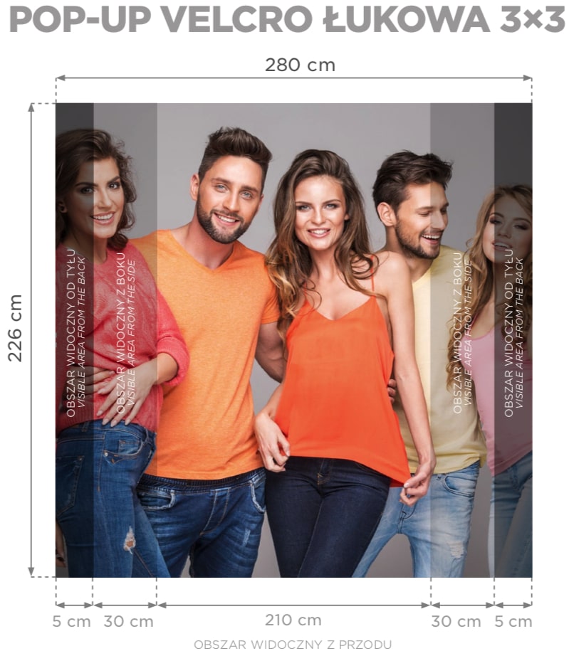 Grafika by měla být vytištěna na jednom kuse textilie. Uvedené rozměry určují viditelnou plochu, proto doporučujeme přidat bezpečnostní okraje – 2 cm z každé strany. Tyto okraje je třeba odstřihnout až po kontrole správnosti tisku. Upozorňujeme, že důležité prvky grafiky by se neměly nacházet v této bezpečnostní zóně.